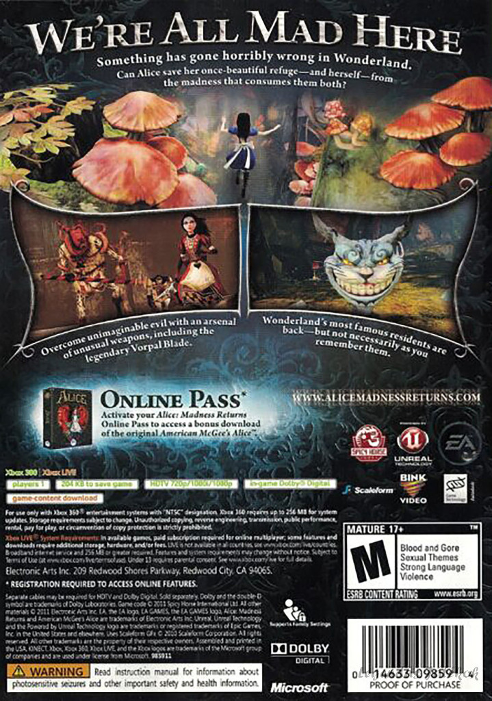Az Alice: Madness Returns egy lenyűgöző akció-kaland játék, amelyet a Spicy Horse fejlesztett és az Electronic Arts adott ki 2011-ben PlayStation 3-ra (továbbá Xbox 360-ra és PC-re is). A játék egyedi hangulatával, gótikus esztétikájával és pszichológiai mélységével azonnal magával ragadja a játékosokat, akik egy sötét és csavaros Csodaországba merülhetnek el Alice oldalán.