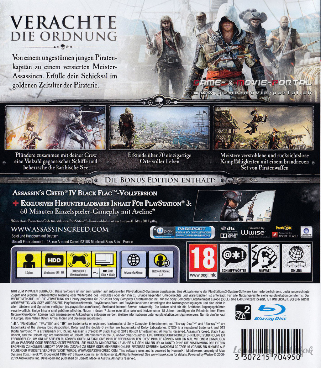 Az Assassin's Creed IV: Black Flag egy 2013-ban megjelent akció-kaland videojáték, amelyet az Ubisoft fejlesztett és adott ki. Ez a hatodik fő része az Assassin's Creed sorozatnak, de a kronológiai sorrendben a negyedik. A játék története 1715-ben játszódik, és főként a Karib-térségben, a kalózkodás aranykorában zajlik.