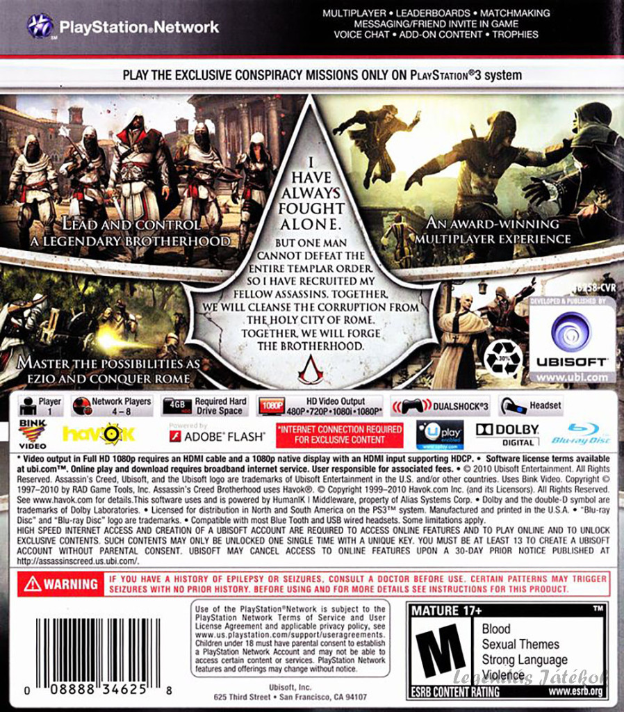 Az Assassin's Creed: Brotherhood egy meghatározó cím az Assassin's Creed sorozatban, amely új szintre emelte a sorozatot azáltal, hogy továbbfejlesztette a játékmenetet és bevezette a többjátékos módot. A történet, a karakterek és a részletesen kidolgozott világ mind hozzájárulnak a játék hosszan tartó vonzerejéhez.