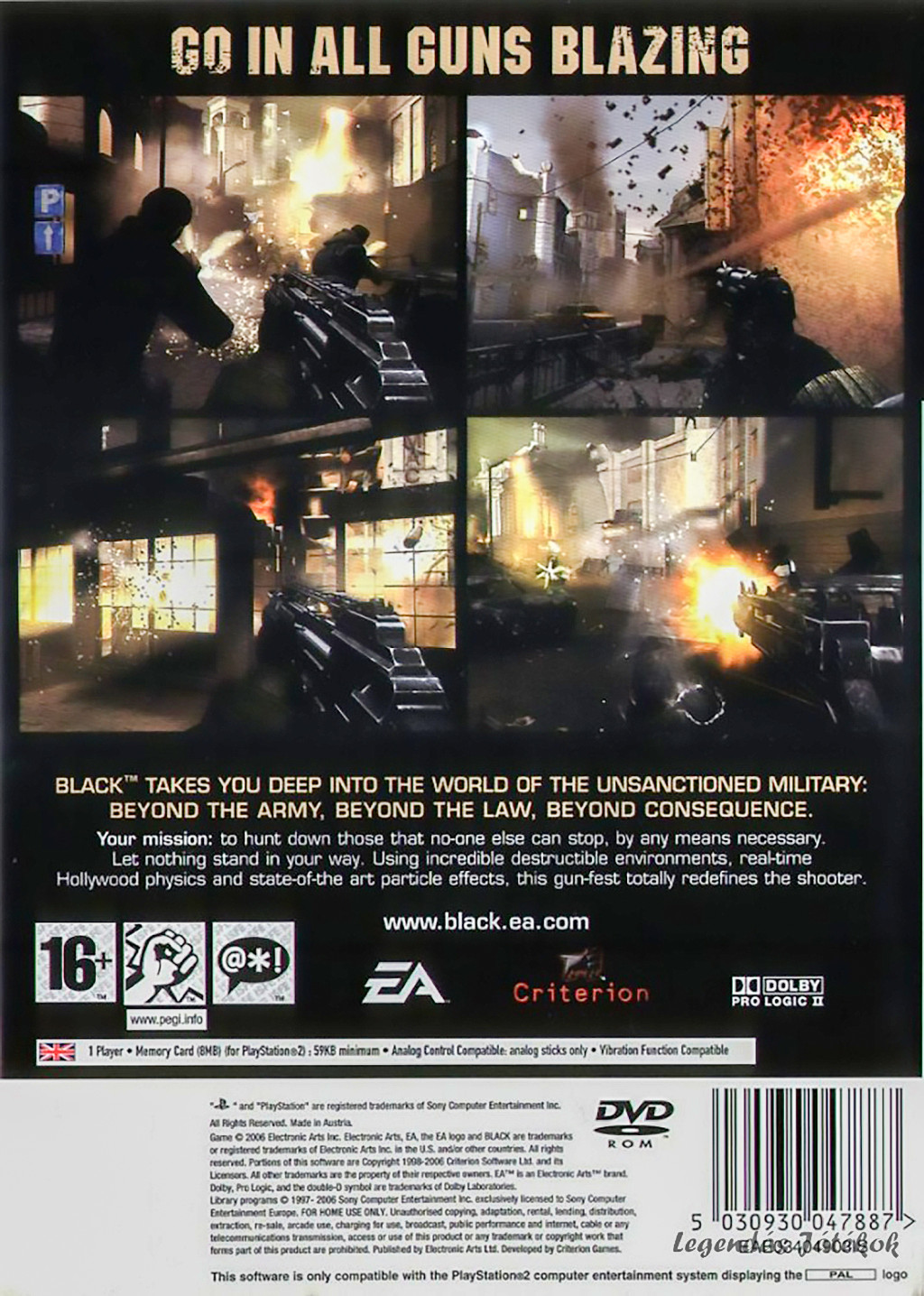 A Black több szempontból is mérföldkő volt az akkori konzolgenerációkra megjelent játékok között, ugyanis ez volt az első olyan fps játék, amiben rendkívül részletesen voltak a fegyverek ábrázolva, valamint a játékban használt elmosódási effektek és átvezető animációk is egyedinek számítottak.