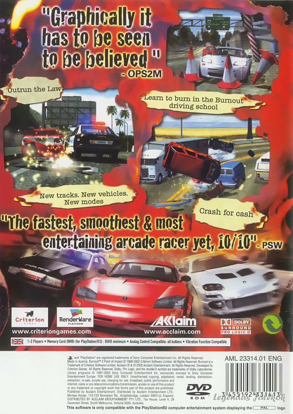 A Burnout 2: Point of Impact egy adrenalintól fűtött, sebességmániás arcade autóverseny-játék, amelyet a Criterion Games fejlesztett és 2002-ben jelent meg PlayStation 2 konzolra, és azonnal belopta magát a versenyjátékok rajongóinak szívébe. A játék lényege nem csupán a gyorsaság, hanem a vakmerőség is: minél közelebb suhansz el más autók mellett, minél többet kockáztatsz, annál több boostot kapsz, így a veszélyes manőverek nem büntetve, hanem jutalmazva vannak.