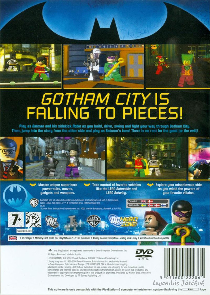 Összefoglalva: a LEGO Batman PS2‑n egy eredeti és kreatív LEGO‑élmény, ahol Batman/DC‑ikonok keverednek a jellegzetes építős játékmenettel, mindezt egy saját sztoriba csomagolva, villanós humorral és újrajátszható tartalommal—tökéletes időtöltés.