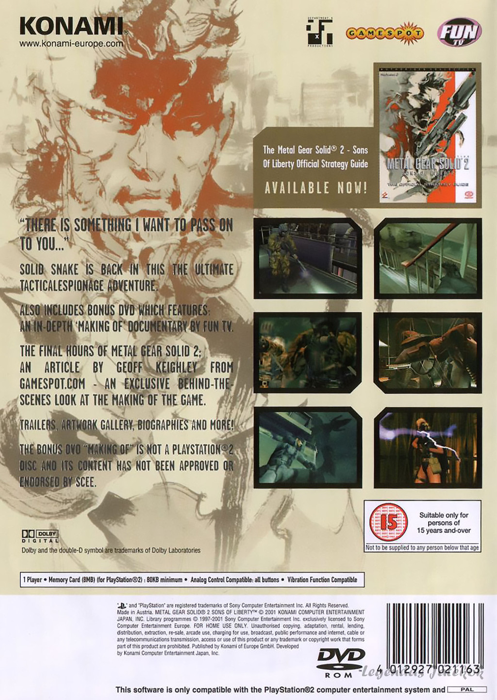 A Metal Gear Solid 2: Sons of Liberty egy ikonikus akció-kaland lopakodó játék, amelyet a Konami Computer Entertainment Japan fejlesztett és a Konami adott ki PlayStation 2-re. Az észak-amerikai megjelenési dátuma 2001. november 13. volt, Japánban november 29-én, Európában pedig 2002. március 8-án debütált. Hideo Kojima rendezőként és producerként is aktívan részt vett a fejlesztésben, Tomokazu Fukushima pedig a forgatókönyvért felelt, amely rendkívül mély és komplex történetet kínált.