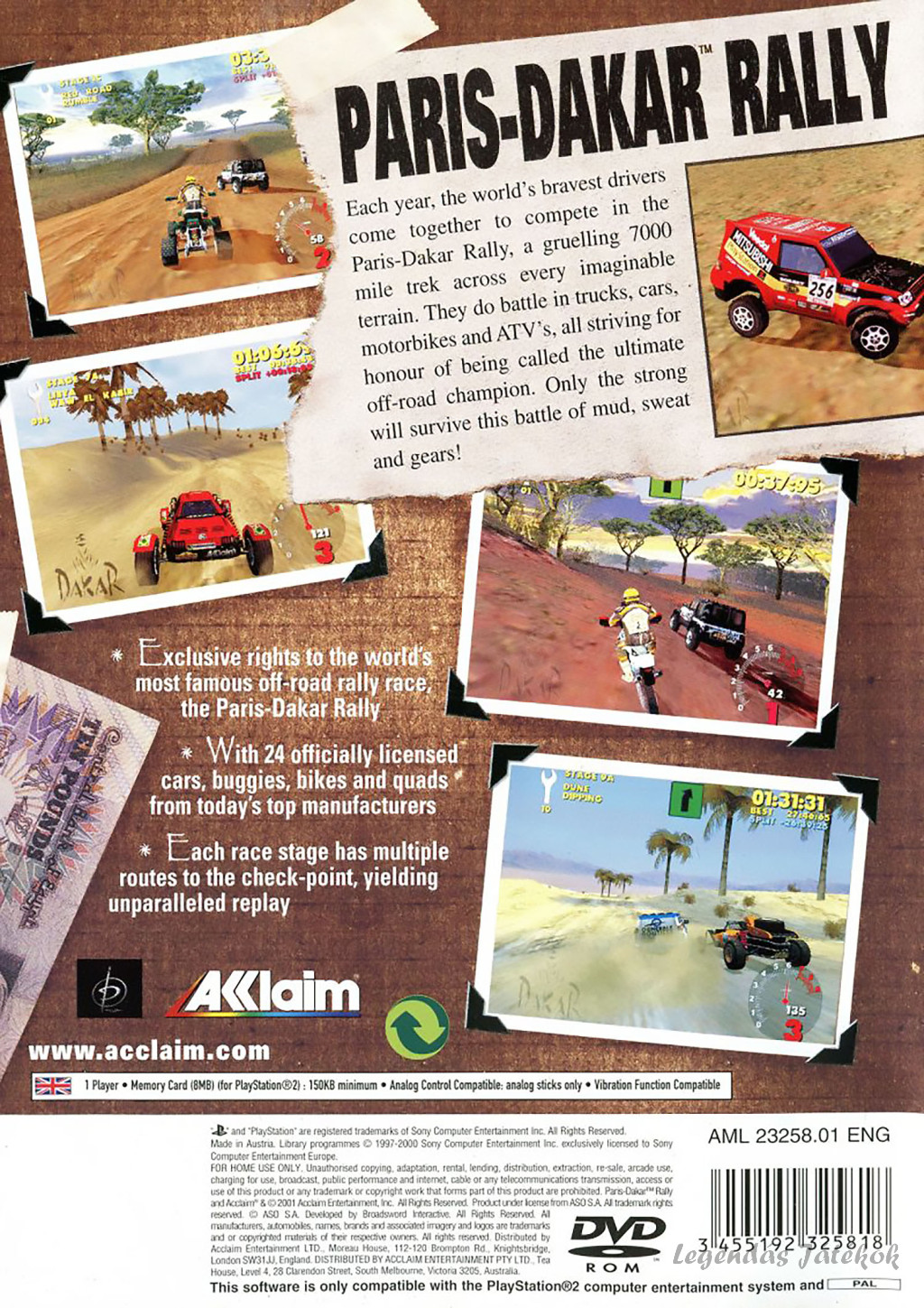 A Paris - Dakar Rally egy tereprally szimulátor játék, amelyet a Acclaim Studios Cheltenham (korábban Probe Entertainment) fejlesztett és az Acclaim Entertainment adott ki PlayStation 2 konzolra. A játék 2001-ben jelent meg, és a híres Dakar Rally verseny hivatalos licence alapján készült.