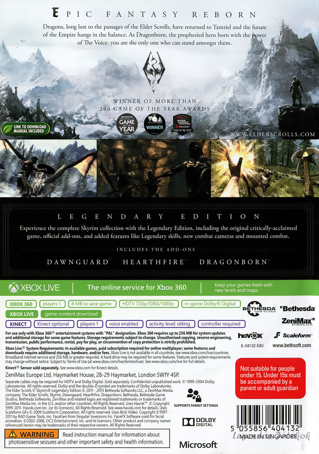 A The Elder Scrolls V: Skyrim – Legendary Edition Xbox 360-ra 2013. június 4-én jelent meg, és a játékot a Bethesda Game Studios fejlesztette, míg a kiadásért a Bethesda Softworks felelt. Ez a kiadás az eredeti, díjnyertes Skyrim játék mellett tartalmazza mindhárom hivatalos kiegészítőt – Dawnguard, Hearthfire és Dragonborn –, így egy teljes, minden részletében gazdag szerepjátékos élményt kínál.